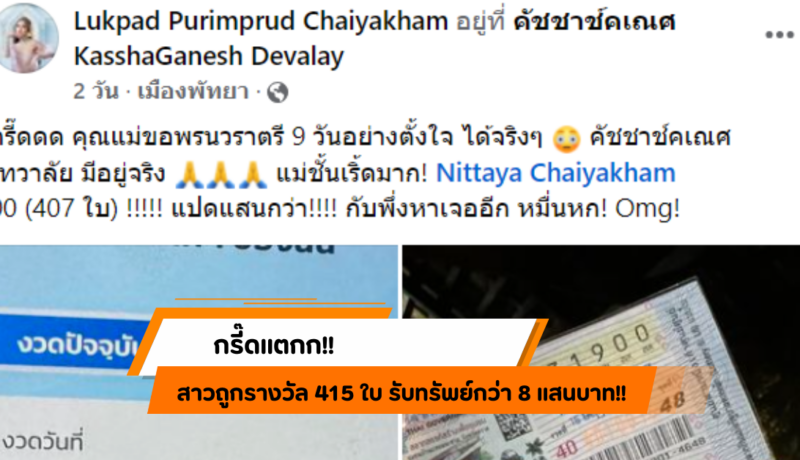 ลูกปัด ปุริมปรัชญ์ ไชยะคำ เธอได้โพสต์ภาพลอตเตอรี่ที่ถูกรางวัลลงบนเฟซบุ๊กส่วนตัว พร้อมข้อความแสดงความดีใจสุดขีด โดยระบุว่า “กรี๊ดดด คุณแม่ขอพรนวราตรี 9 วันอย่างตั้งใจ ได้จริงๆ คัชชาช์คเณศเทวาลัย มีอยู่จริงแม่ชั้นเริ้ดมาก! 00 (407 ใบ) !!!!! แปดแสนกว่า!!!! กับพึ่งหาเจออีก หมื่นหก! Omg!”